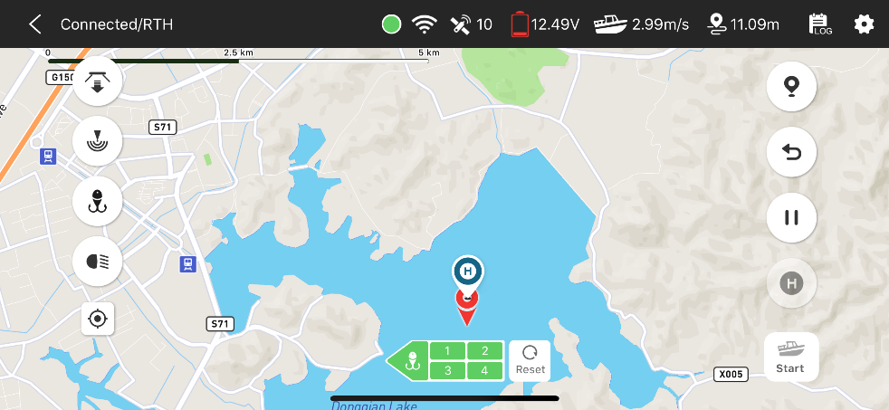 Puede permanecer en la "Interfaz de tareas" del control remoto; mueva el joystick hacia arriba para volver a la "Pantalla de inicio". En la "Pantalla de inicio", podrá conducir el barco en la dirección que desee.
